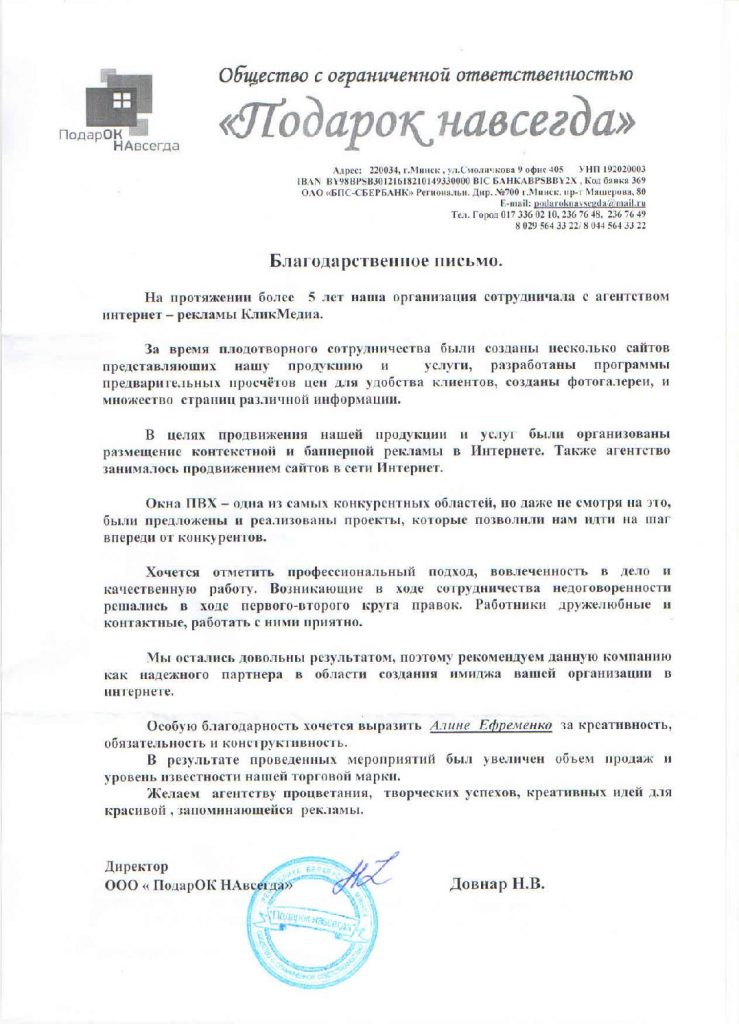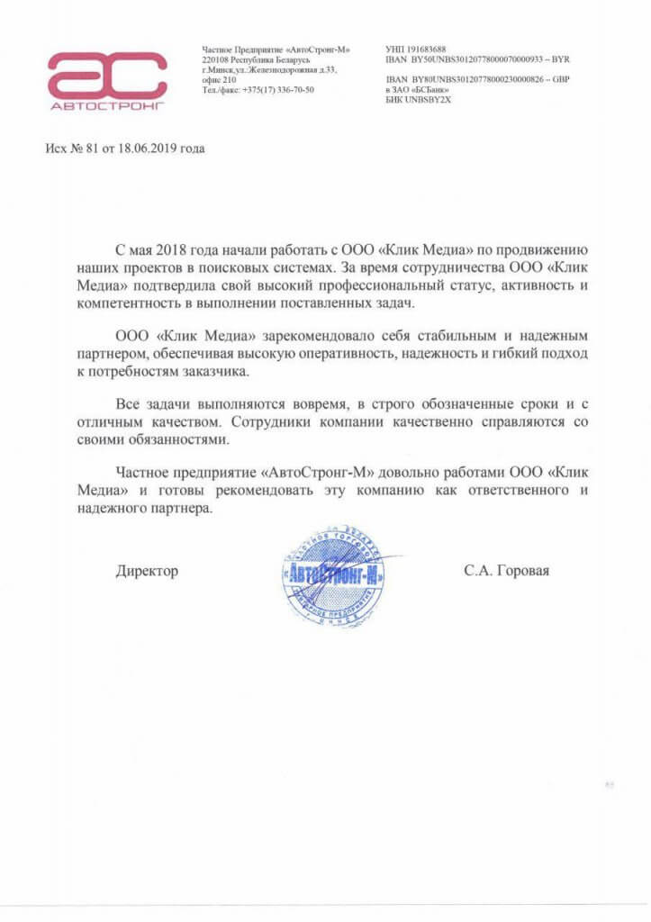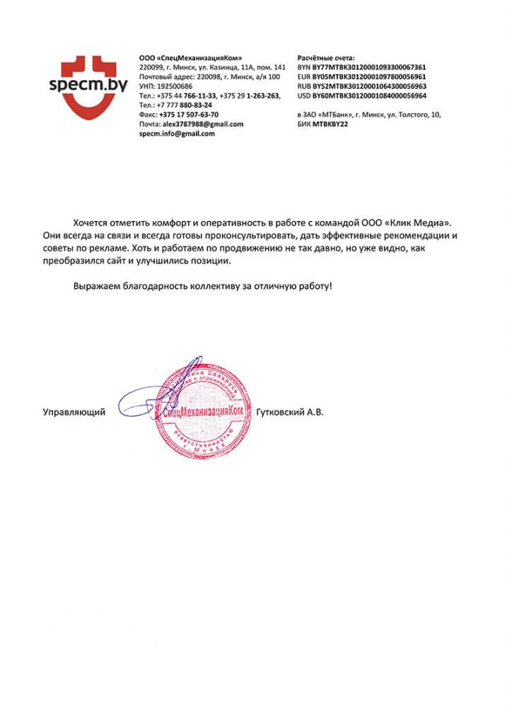 С мая 2018 года начали работать с ООО «Клик Медиа» по продвижению наших проектов в поисковых системах. За время сотрудничества ООО «Клик Медиа» подтвердила свой высокий профессиональный статус, активность и компетентность в выполнении поставленных задач.