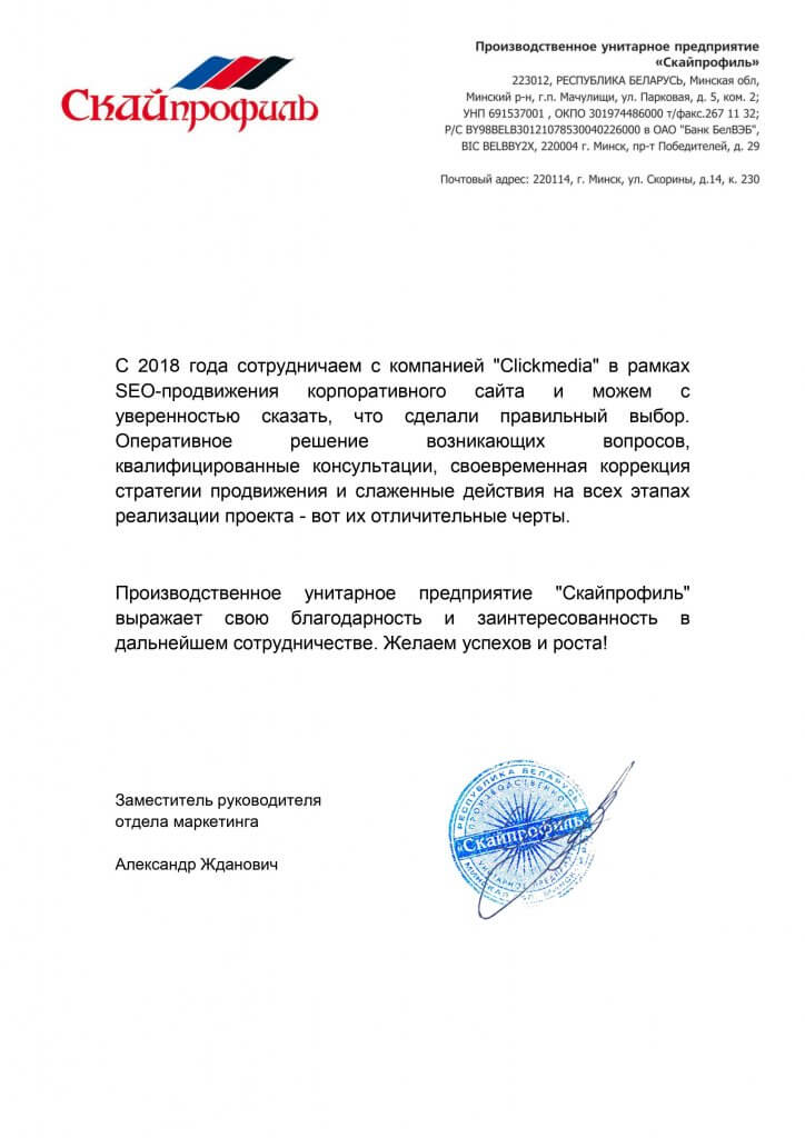 С 2018 года сотрудничаем с компанией «Clickmedia» в рамках SEO-продвижения корпоративного сайта и можем с уверенностью сказать, что сделали правильный выбор. Оперативное решение возникающих вопросов, квалифицированные консультации, своевременная коррекция стратегии продвижения и слаженные действия на всех этапах реализации проекта — вот их отличительные черты.